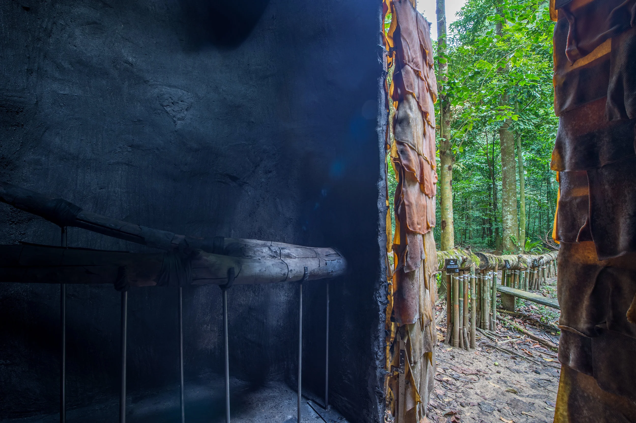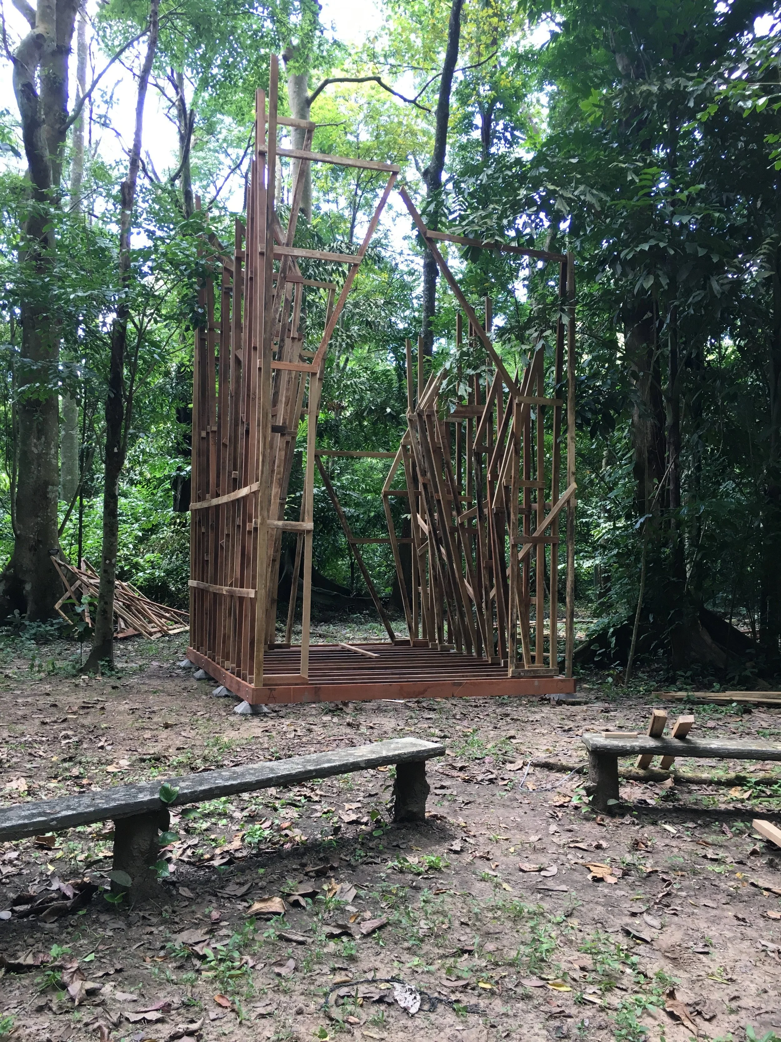 Our museum as sculpture took the form of a small mysterious building clad in raw, smoked rubber shingles, interrupted by a fallen rubber tree from a nearby rubber plantation. When the tree intersects the museum, it transforms to pure carbon having been charcoalized at the nearby charcoal kilns. On the other side of the museum, the rubber tree canopy continues. Along the way, museum "didactics" label the parts of the tree and forest with reminders of the geological time frames we exist within. Once inside the museum, the didactics stop and the visitor is immersed in a cave-like carbon interior. Lit only with 3 tunnels of natural light, the interior is made up of stucco coated with carbon paint made from crushed charcoal.