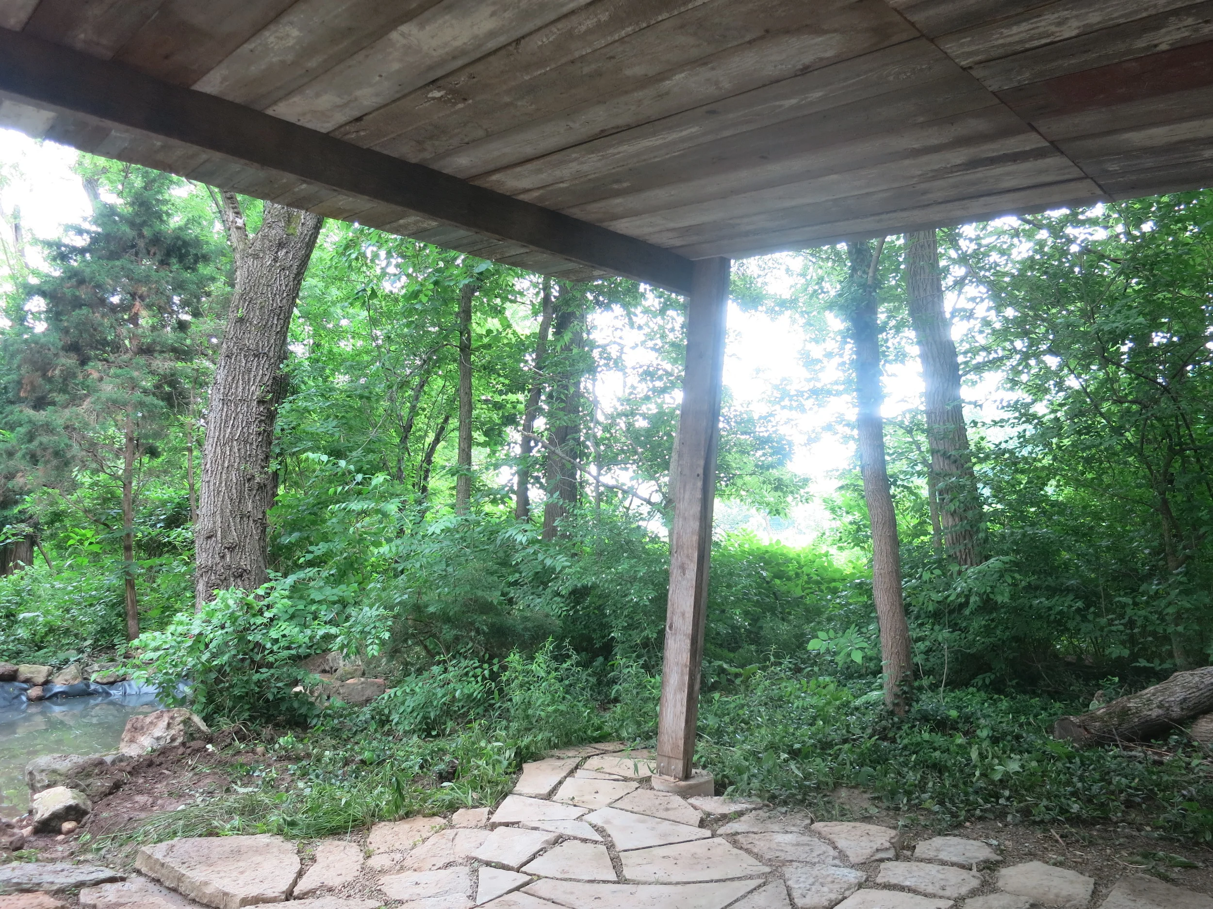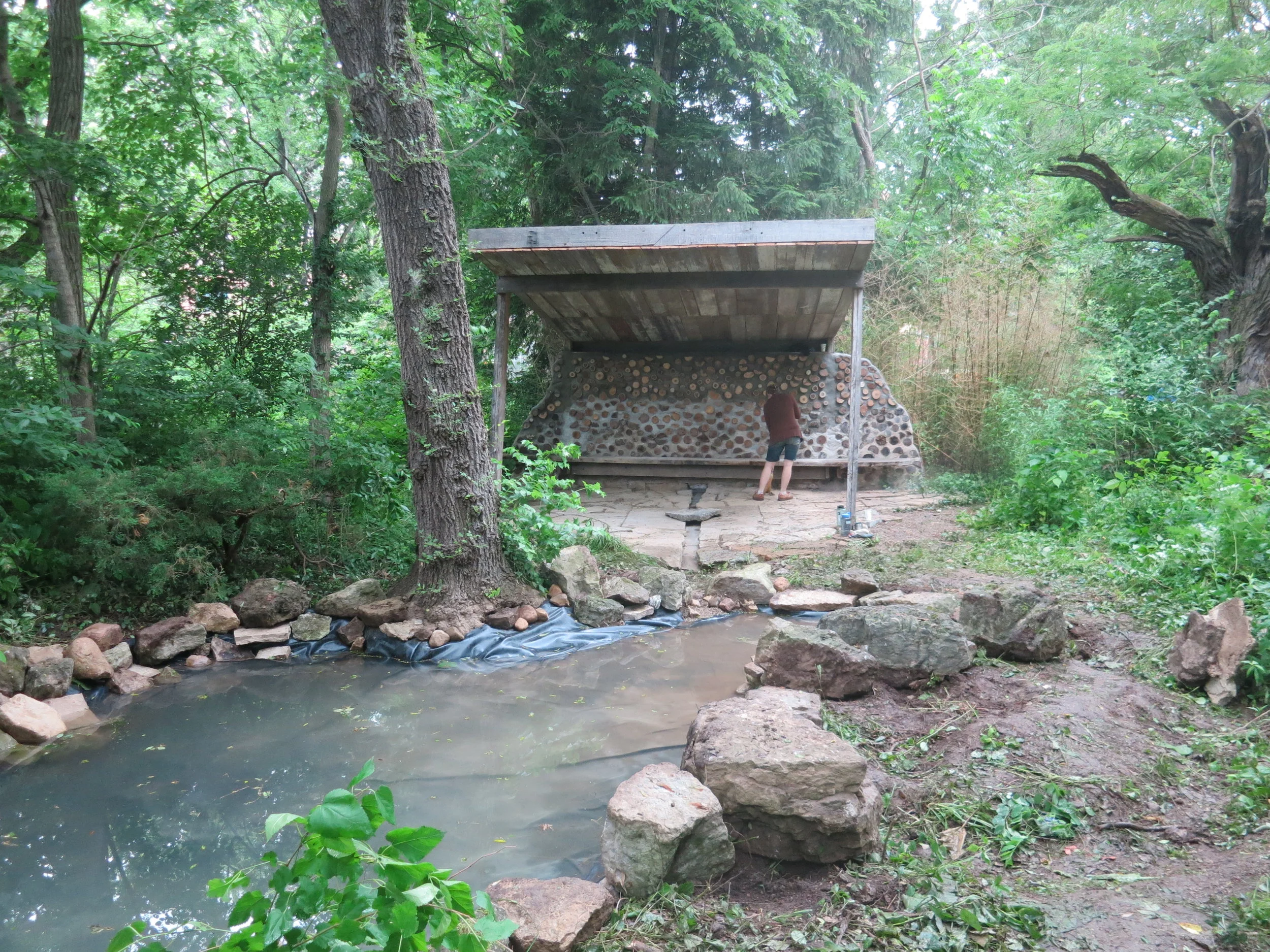 We decided to deconstruct the existing structure and design to re-use the locally milled white oak lumber, still in decent shape. We also decided to incorporate a floor made up of scrap limestone from a nearby quarry, as well as a cordwood masonry wall made up of dried woods from neighbors and the nearby glen.